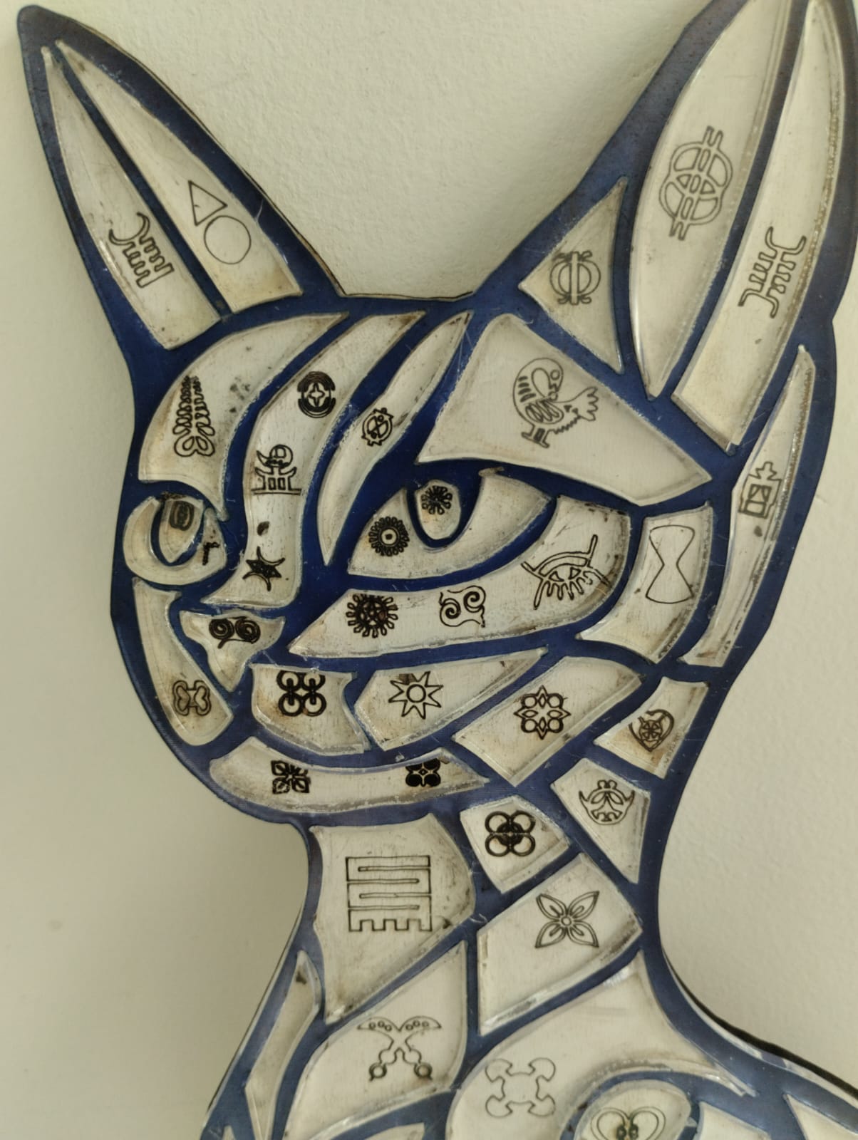 Quadro Recortado modelo gato Cleopatra, com gravação a laser de 70 adinkras , produzido em acrílico na moldura e encaixes, e duratex como fundo