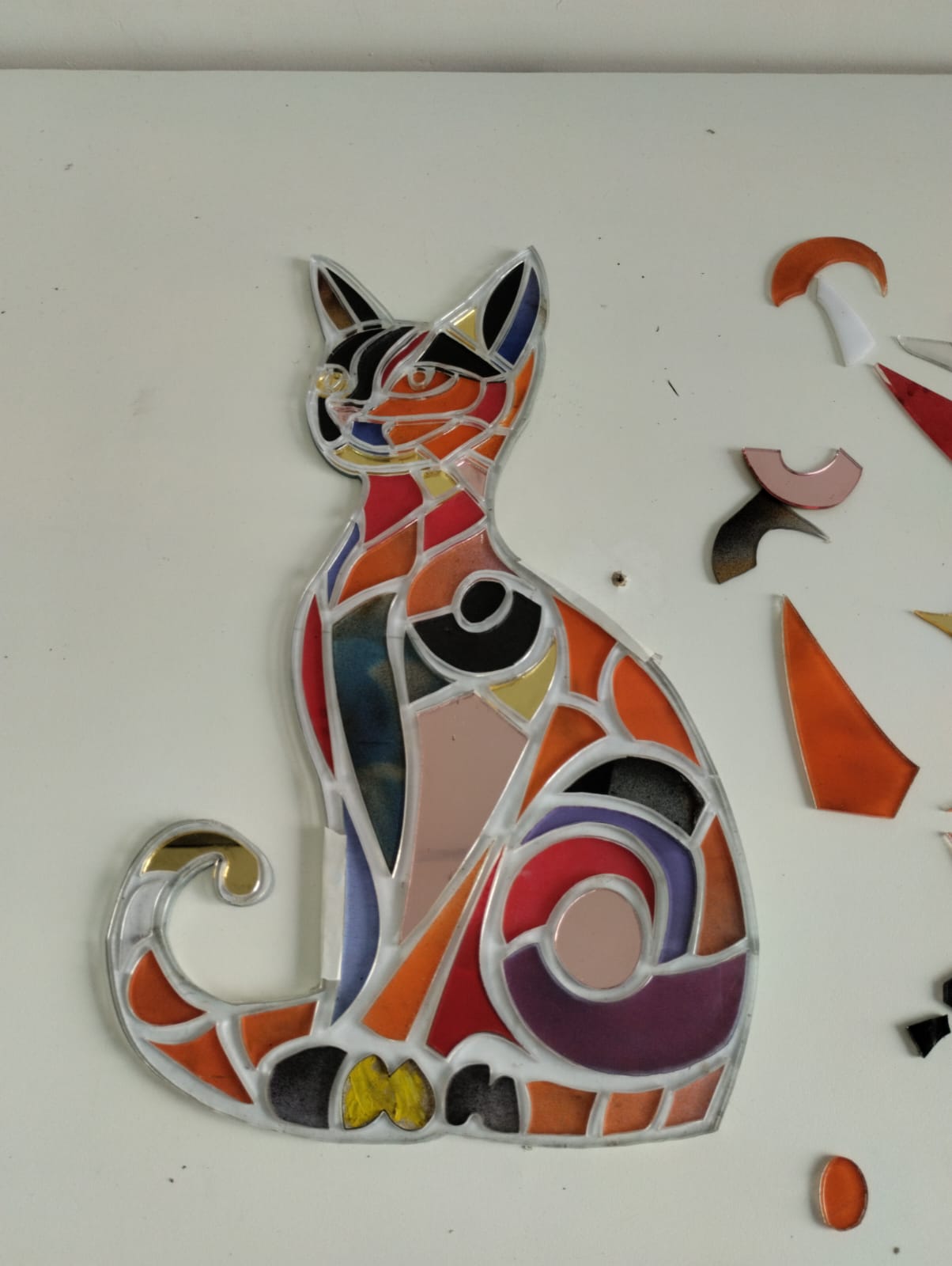 Quebra cabeças em formato de gato com 35 cm de altura, com diversas peças sobressalentes para várias combinações de montagem, produzido em acrilico